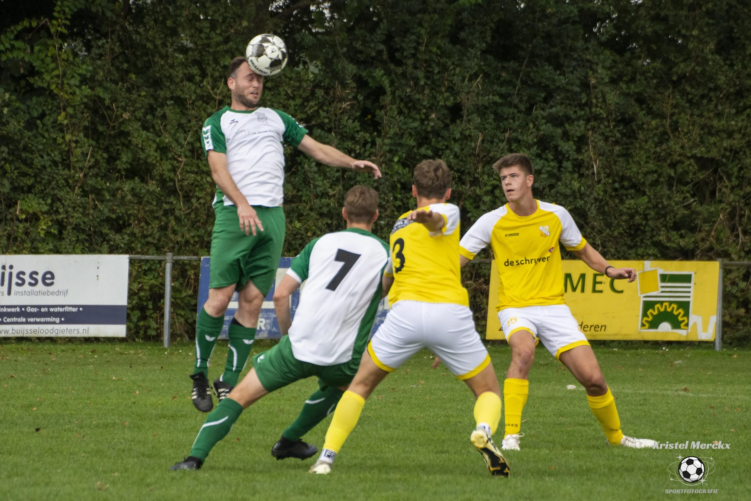 Mee veel gevoel kopt Niels de bal weg, let op zijnen afsprong , voetjes van de vloer !