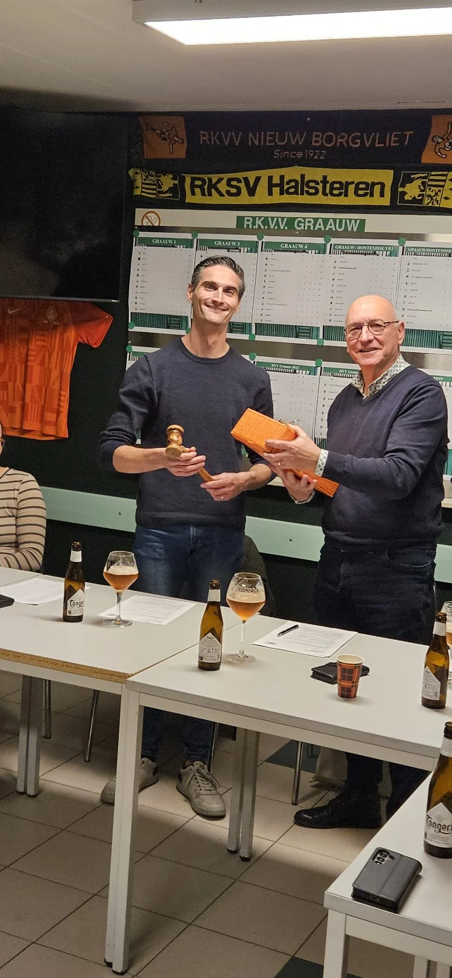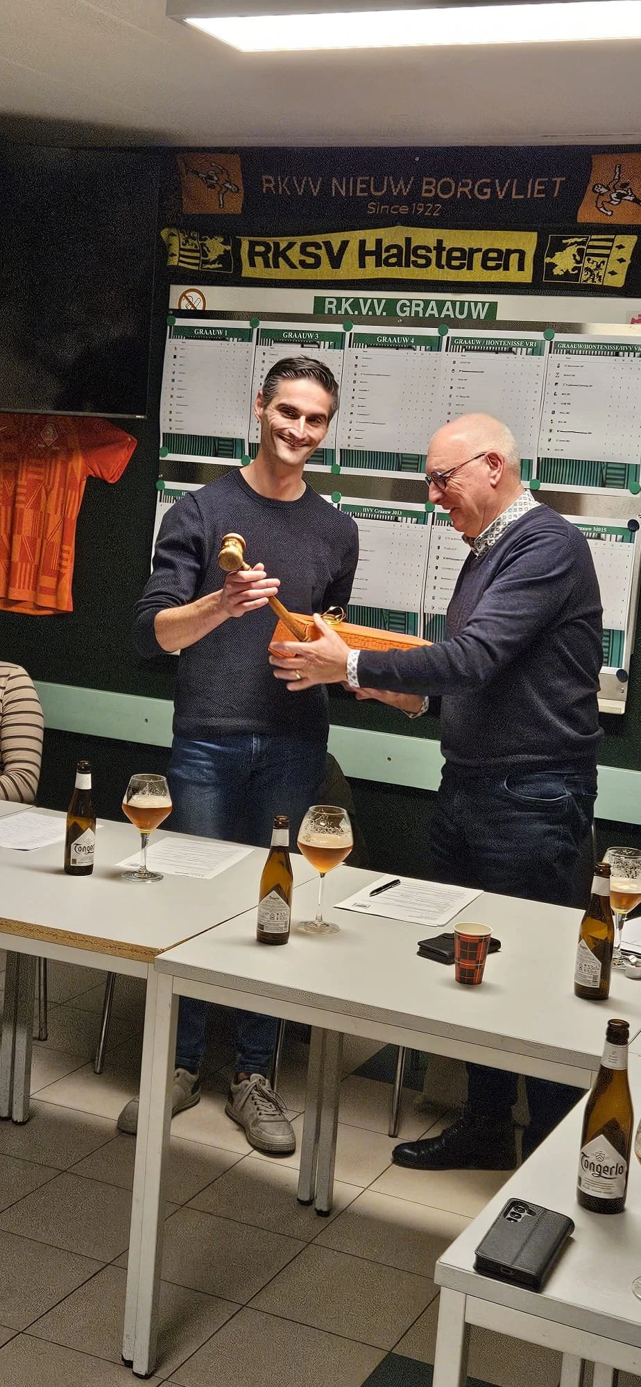Daarom is het ook ze leuk dat onze Combi Graauw-Hontenisse Dames, ook van de partij waren, hun training normaliter afwerkend op “ut PrinseBos” , je ziet dat we als club ook een “bindende” factor hebben. Maar mogelijk was ook wel “ de Proeverij “ een goed excuus !, naast de dames ook veel Graauw Spelers & Sympathisanten, welke deelname aan deze, aangename bijkomstigheid. Deze “ commissie “ introduceerde zich vlotjes, tijdens de intro van de Jaarvergadering, Kris legde eerst de “historiek” uit van het te serveren Biertje, waarna deze in 5 rondes aan de Bar te verkrijgen waren. We begonnen “luchtjes” mee nun Tongerlo !! Ik was op mijn 🚲, dus kon een Proeverij gerust meedoen !