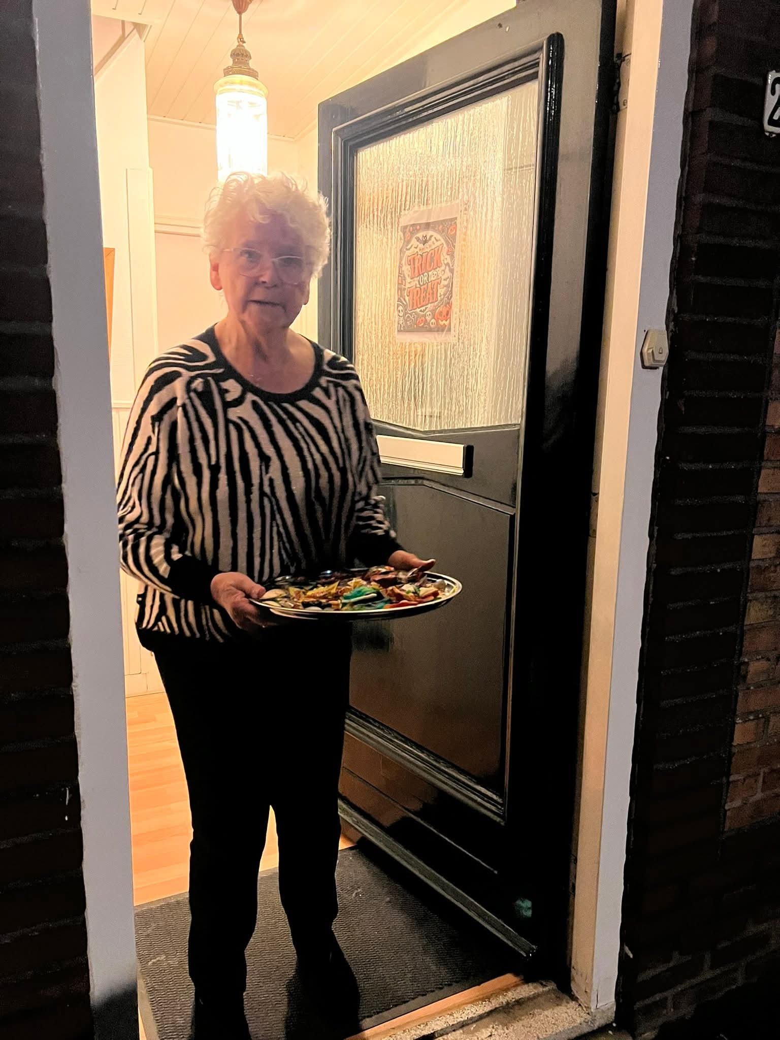 Tijdens de rondgang, komen we toch nog vriendelijke mensen tegen, welke klaar staan met lekkers op de schaal !