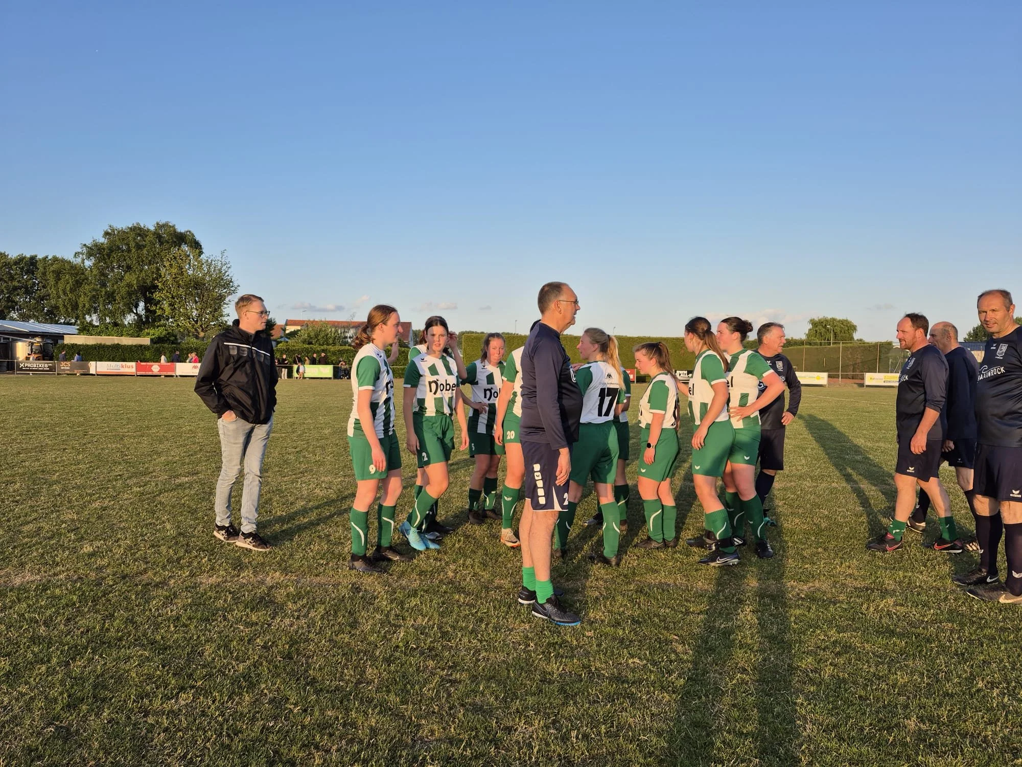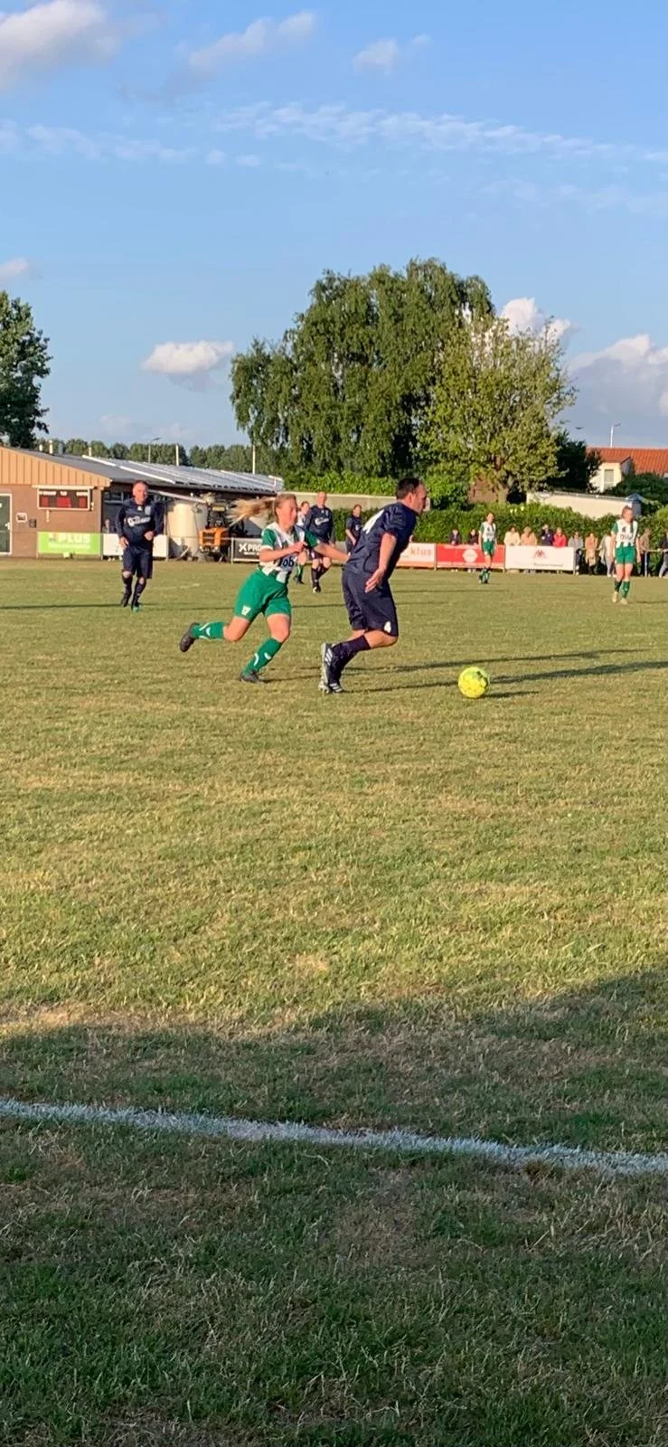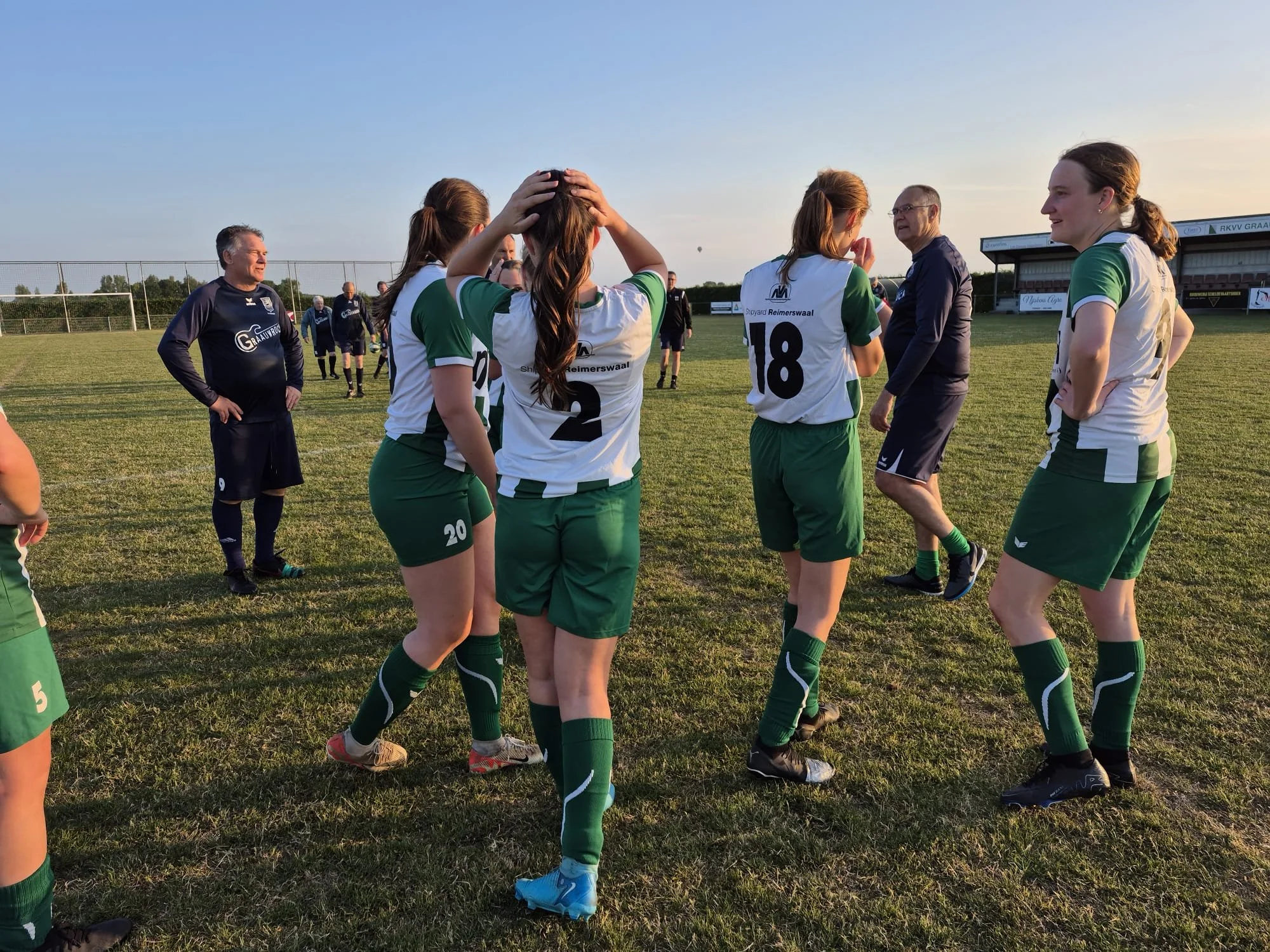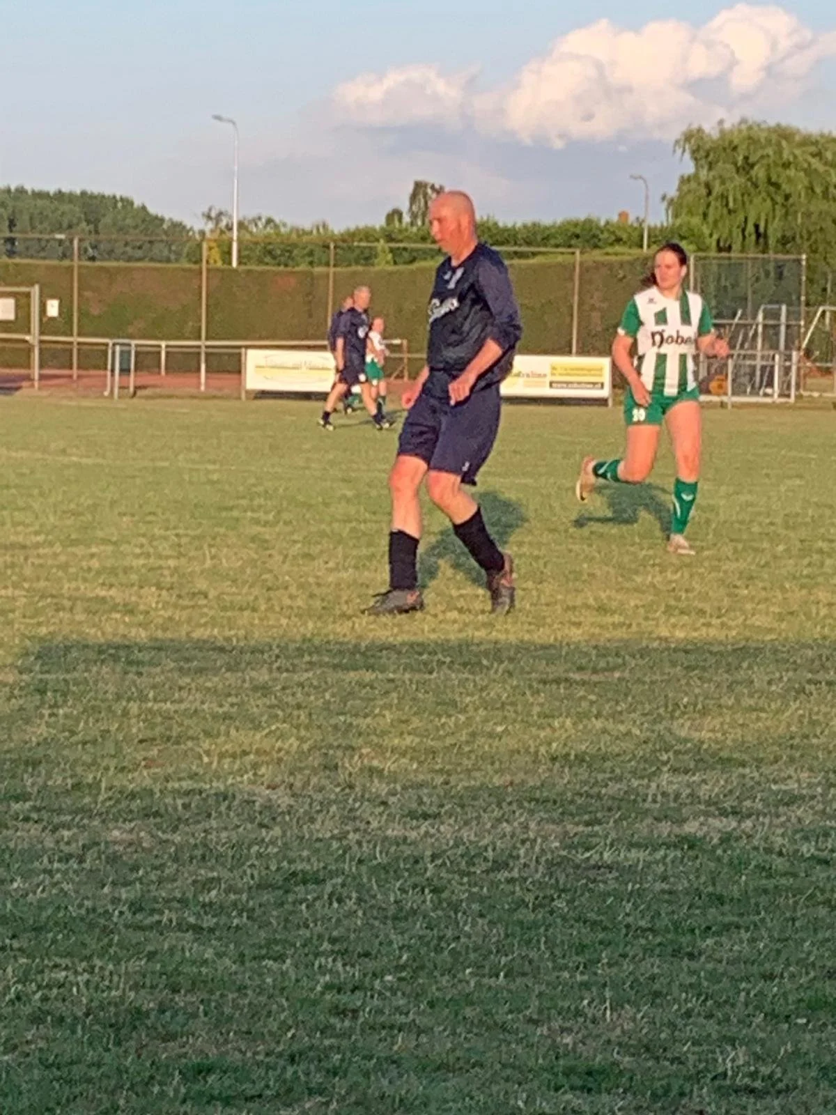 In het kleedlokaal was het snel als vanouds: strak afgetrainde lichamen, duidelijke tactische speech van de coach, gezonde wedstrijdspanning en heel veel energie. Dat trok zich direct door in de warming-up, waar Dames 1 een beetje tegen de railing stond werd er bij oud- Graauw 1 collectief een zeer intensieve warming up gedaan. Ondanks het potje onder het mom van vriendschappelijk gespeeld werd startten toch de sterkste 11 spelers, met enig gemor werd dit toch geaccepteerd door de bankzitters hopend op enkele speelminuten. De wedstrijd begon ietwat afwachtend, Celschelfout zocht openingen op het middenveld maar vond deze lastig, er werden te weinig meters gemaakt zonder bal. maar naar mate de wedstrijd vorderde werden de dames steeds meer op hun helft gedrukt. Cel Robben was een ware plaag voor de hele verdediging met ouderwetse acties sneed hij talrijke keren door de verdediging maar Willem P was telkens te laat voor de afronding, ‘twas niet in de voetjes’. Eerste genoemde moest zeer uitzonderlijk na 10 minuten naar de kant met een spierblessure. Dit was het moment dat iedereen richting, tot dan onzichtbare Van-Oof keek, hij MOEST nu opstaan en het team bij de hand nemen door zich te onderscheiden met gevaarlijke acties. Inzet was er zeker, de gedachte was er maar de uitvoering bleek lastig. Gebroeders Jandaan en Tomdaan zorgden daarentegen wel voor de openingstreffer, knap voorwerk van Jandaan werd snoeihard afgewerkt door Tomdaan. ondertussen deden de Dames serieus wat terug maar Kipper had de acrobatische reddingen nog steeds inzich en wist een tegentreffer te voorkomen. Zo waren ook Bartdaan en Edgar een barricade voor de Dames-aanval. Net voor rust kopte Celvael vanaf de penaltystip op magistrale wijze een corner diagonaal de kruising binnen.