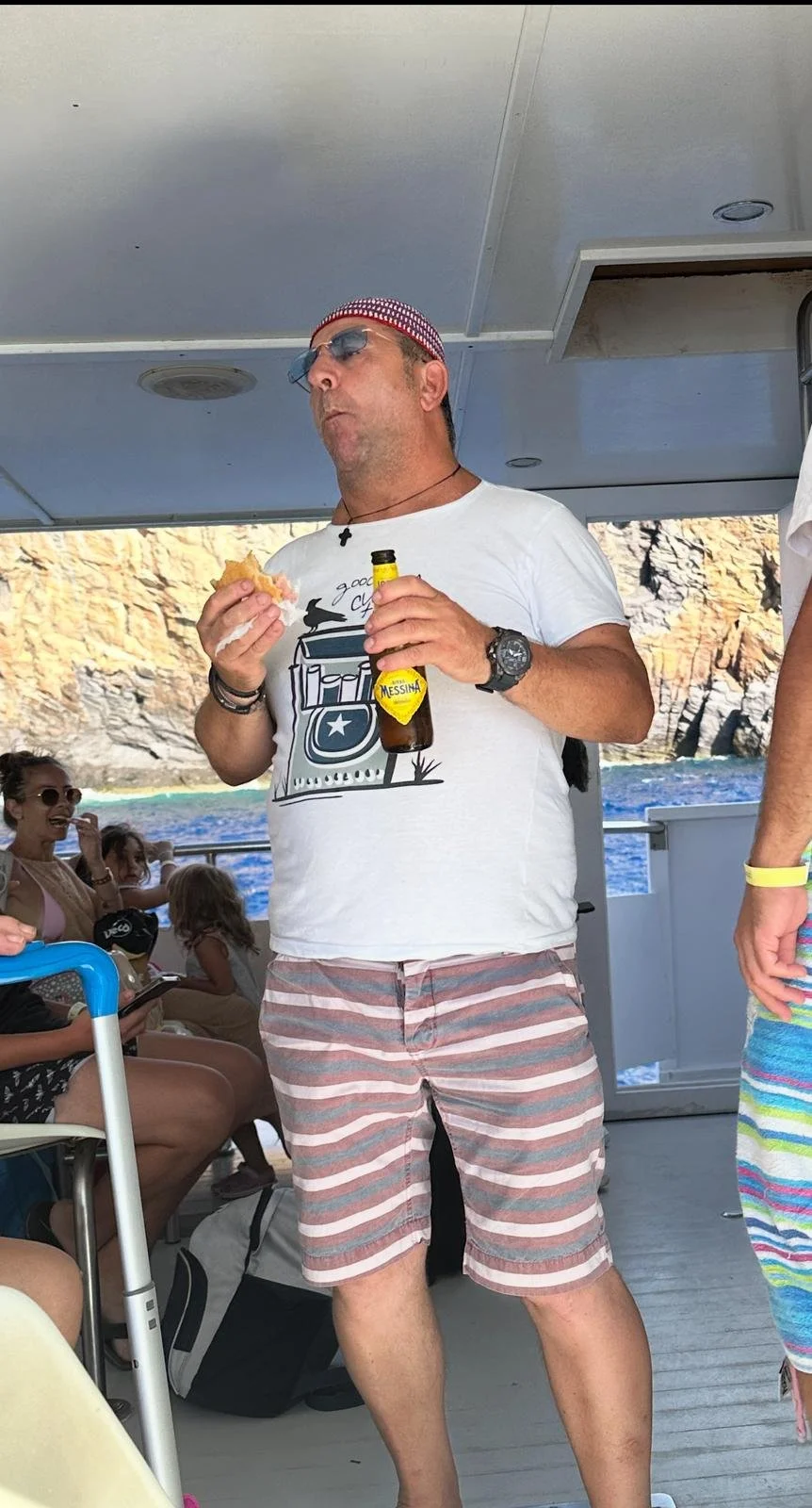 Ook werd een “rondje mee ut pontje gemaakt”, dan kan ier spijtig genoeg nie meer, De Tourguide drinkt hier Messina ( mogelijk is deze drank vernoemd naar een van de voormalige PSD Boten, welke daar varen in “de straat van Messina. En hoe luidt dan het spreekwoord, na de rondvaart en uitleg ? Dont Forget The Guide !! ( mogelijk hebben ze deze man nog consumptie bonnen gegeven van Graauw Rock, lichting 2019 !! )