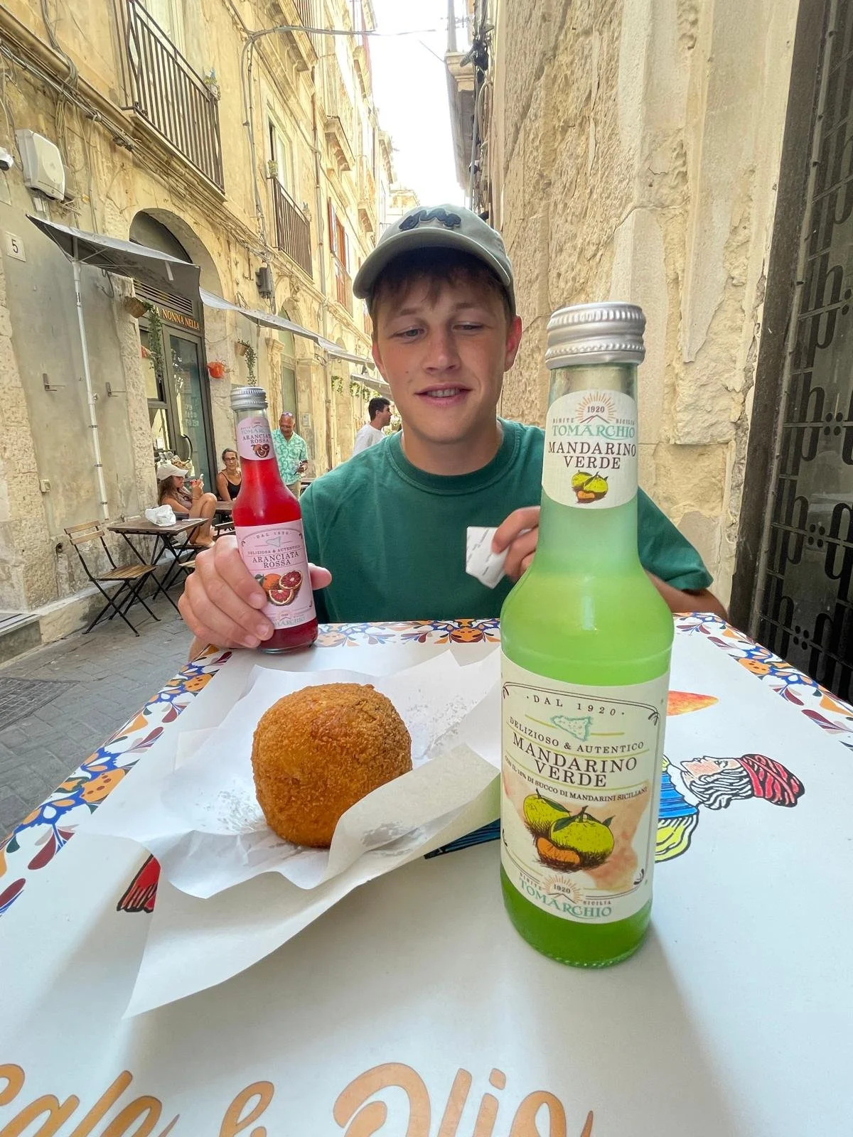 We zien hier onze Kevin, samen mee zijn Lief Lynn op verlof naar een Italiaans eiland: Hier werd een typische Siciliaanse Arencino opgegeten, ut smaakte heel lekker. Wat valt verder op aan deze foto ? Aranciata Rossa, lijkt op een siroop mee water , terwijl Lynn, Mandarino Verde voor zich heeft staan, iets mee nun mandarijn peis ik, maar groen van kleur, dus de clubkleur is niet vergeten !