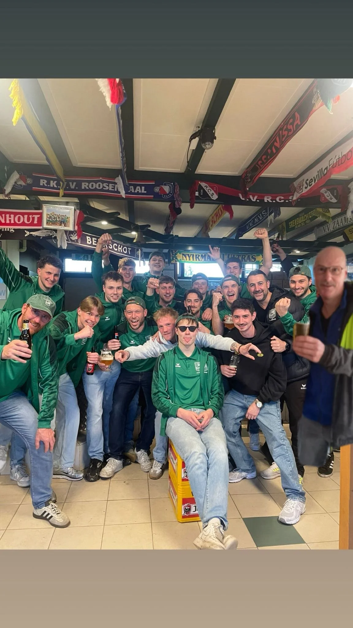 Winnaars tegen Grenswachters, met Alex uit de foto sjop, hij dronk zijn overwinning pilsje op dn ๐8, in de Berlaere kantine.