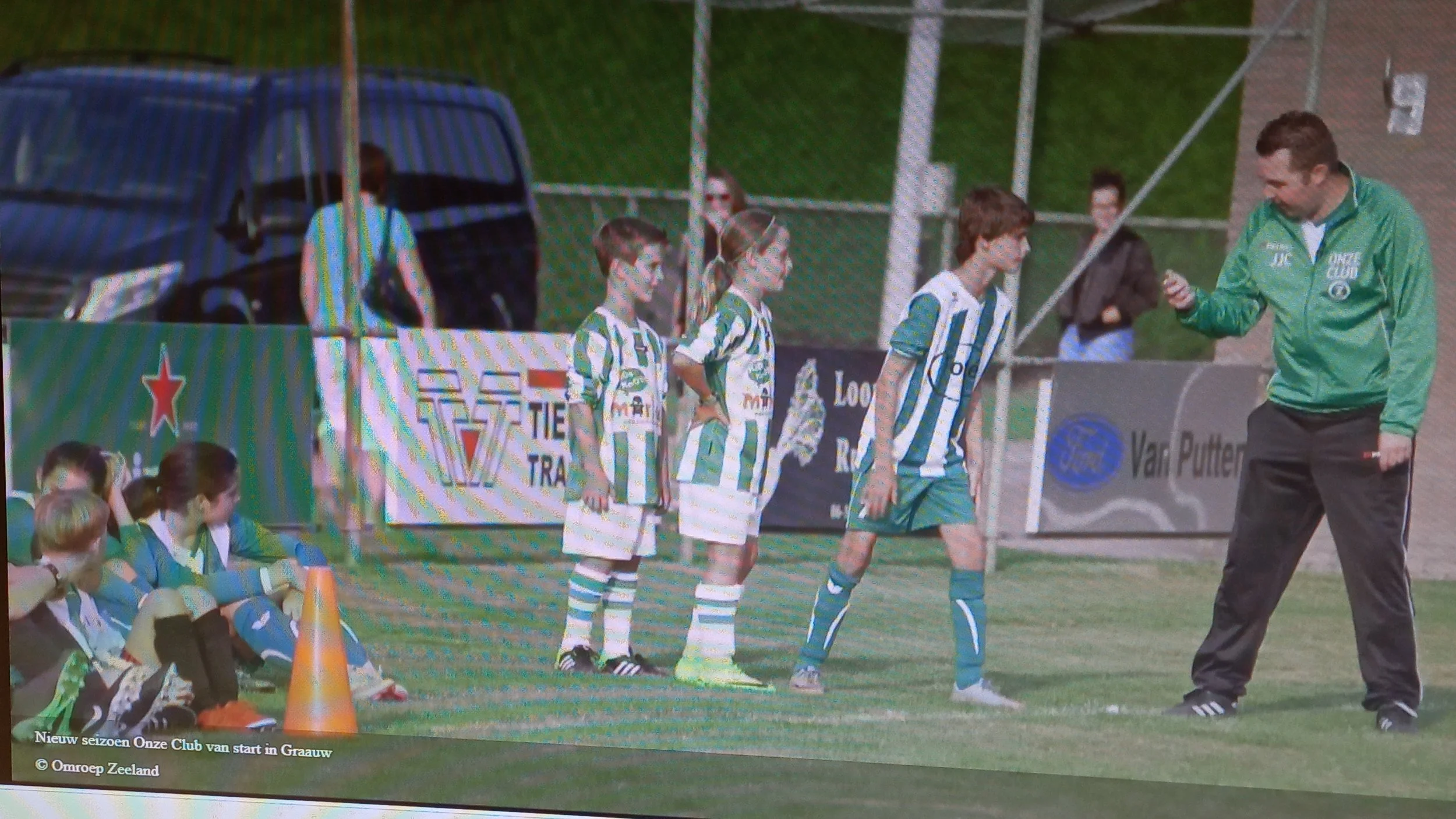 Terwijl ik terug ging in gedachte, die mannen waren ook live te zien in programma van onze club ( 09-2017 ), hoe ze onze Jan Jaap, vakkundig uitleg gaven over hoe je de lijnen dient te zetten, dit mag zeker geen “onder geschoven aandacht puntje “ zijn, immers geen lijnen, gene voetbal. Deze mannen hebben dit jaren samen gedaan & als je dit dan samen, met 90 jaar nog kunt delen, is Graauw dan ook TROTS op 💚💚, tevens zien we op deze foto van Jan Jaap, 3 voetbal talenten ( in de jeugd regionalen ), Laurien heeft een imposante voetbal loopbaan afgelegd & nu trotse speelster dan de Combi Graauw Hontenisse 💚💙.