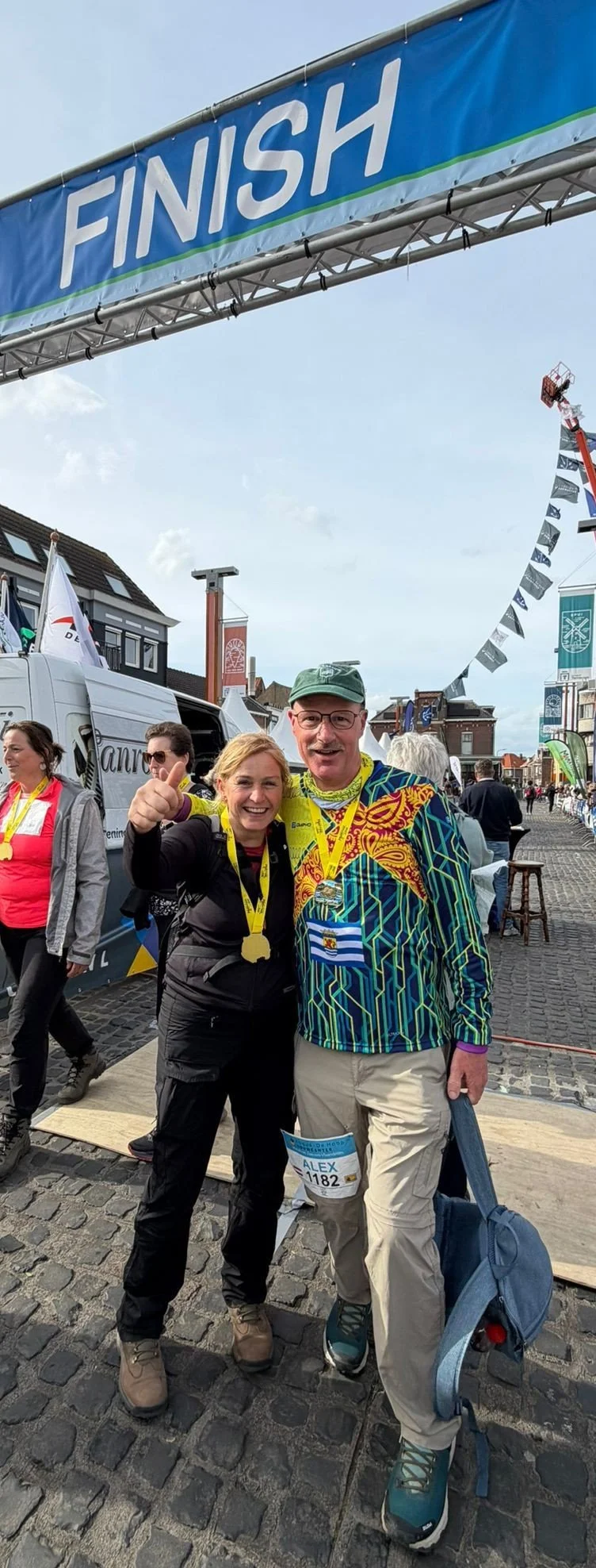 Op de Zondag liep Alex zijn Wandel Marathon. Getooid in zelf ontworpen shirt, maar toch โzoals vanzelfsprekendโ een Stimulans Speech inspreken voor โut 1eโ , maar ook met een blik op de klok, weet hij nog vlug een boodschap aan te leveren !