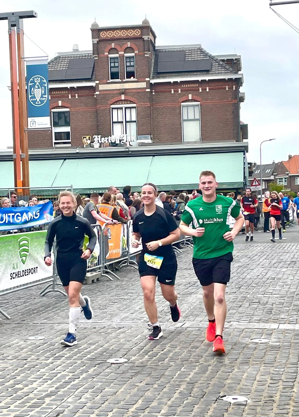 Estafette Groep met > Robbin - Jente & Jelle > Jelle loopt het Graauw Groen, met Logo over de Terneuzense Finish ๐